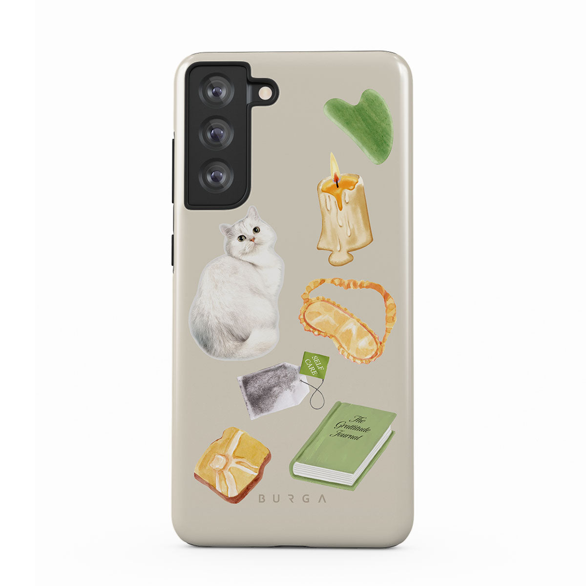 Questo design include: gatto bianco, libro verde, candela, Gua Sha bar, maschera per dormire, bustina di tè, cristallo giallo.
