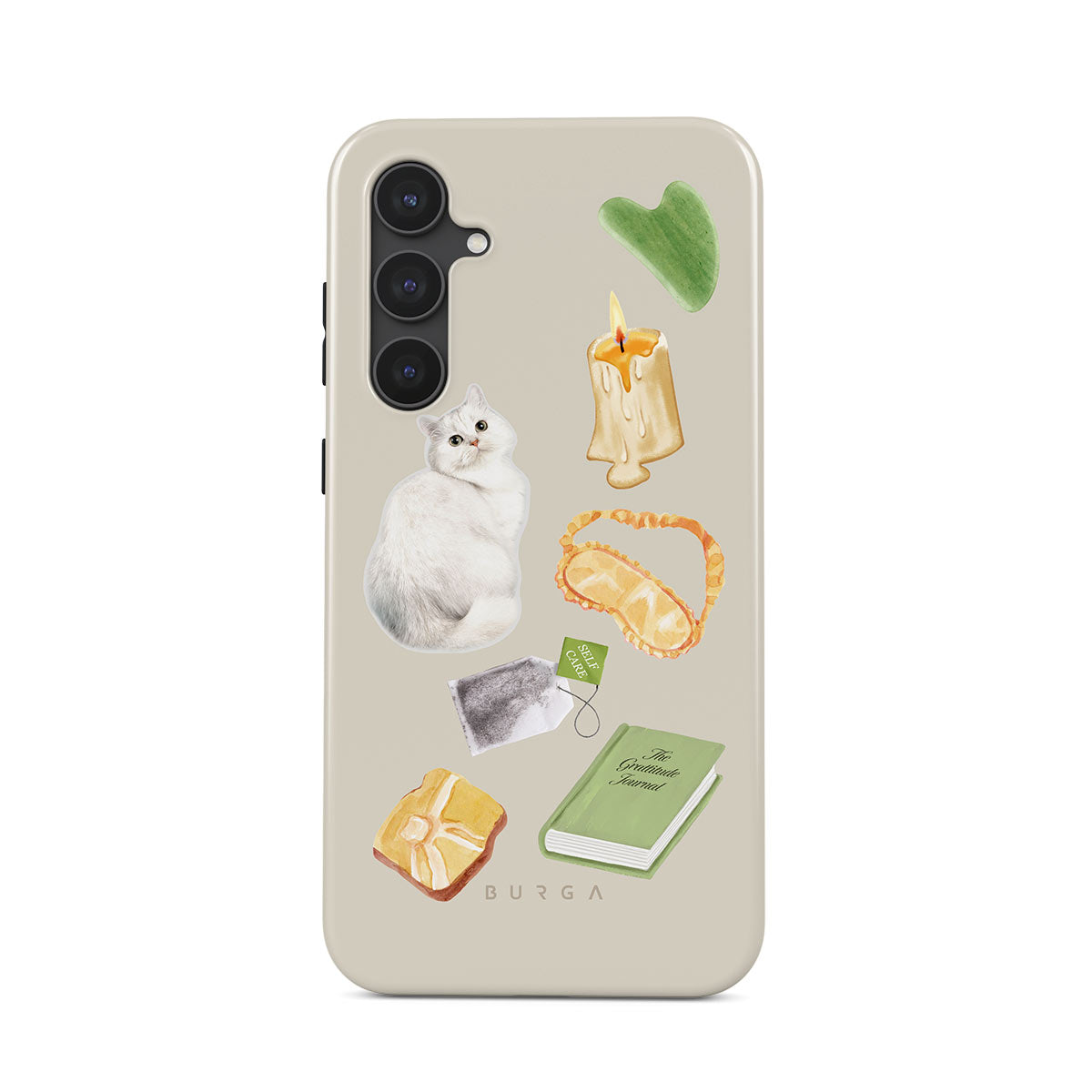 Questo design include: gatto bianco, libro verde, candela, Gua Sha bar, maschera per dormire, bustina di tè, cristallo giallo.