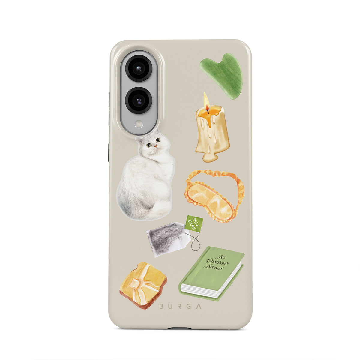 Questo design include: gatto bianco, libro verde, candela, Gua Sha bar, maschera per dormire, bustina di tè, cristallo giallo.