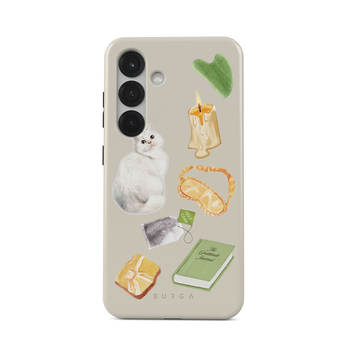 Questo design include: gatto bianco, libro verde, candela, Gua Sha bar, maschera per dormire, bustina di tè, cristallo giallo.