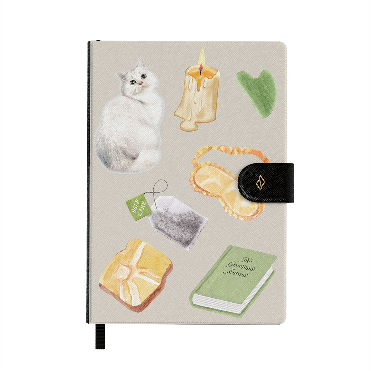 Questo design include: gatto bianco, libro verde, candela, Gua Sha bar, maschera per dormire, bustina di tè, cristallo giallo.
