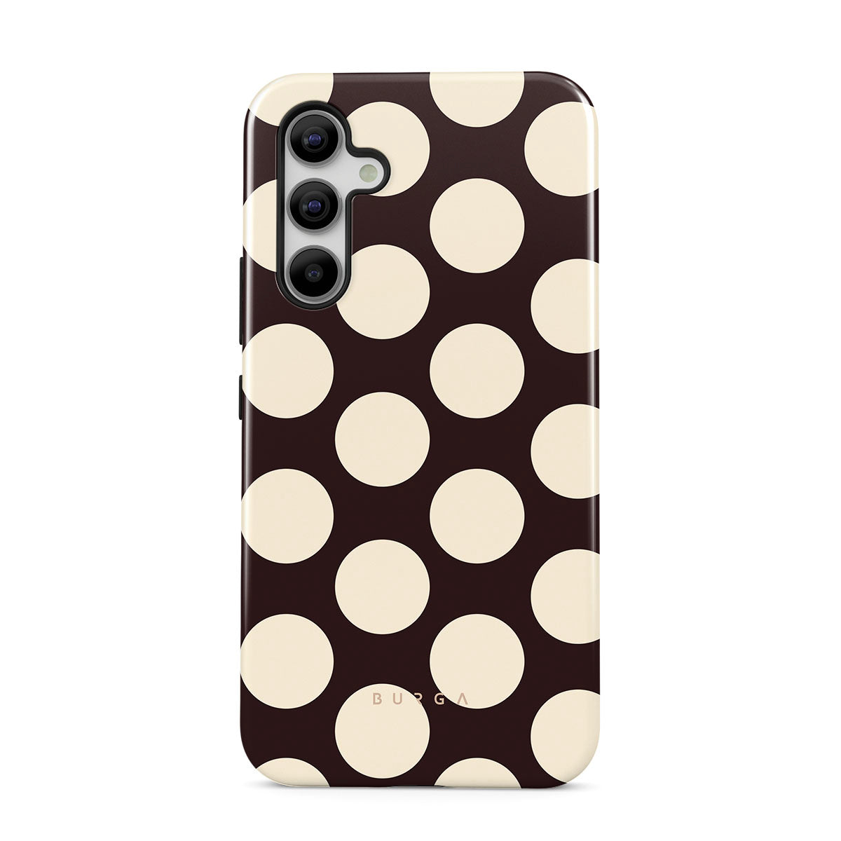 Questo design include: grandi pois color crema su uno sfondo scuro.