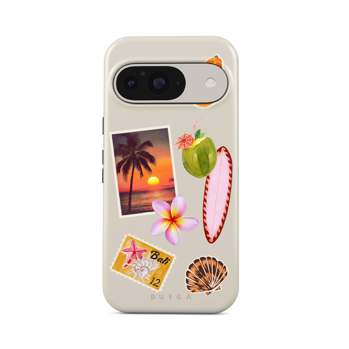 Questo design include: foto di tramonto tropicale, papaya, noce di cocco verde, tavola da surf rosa, fiore di plumeria rosa, conchiglia arancione, cartolina di Bali.