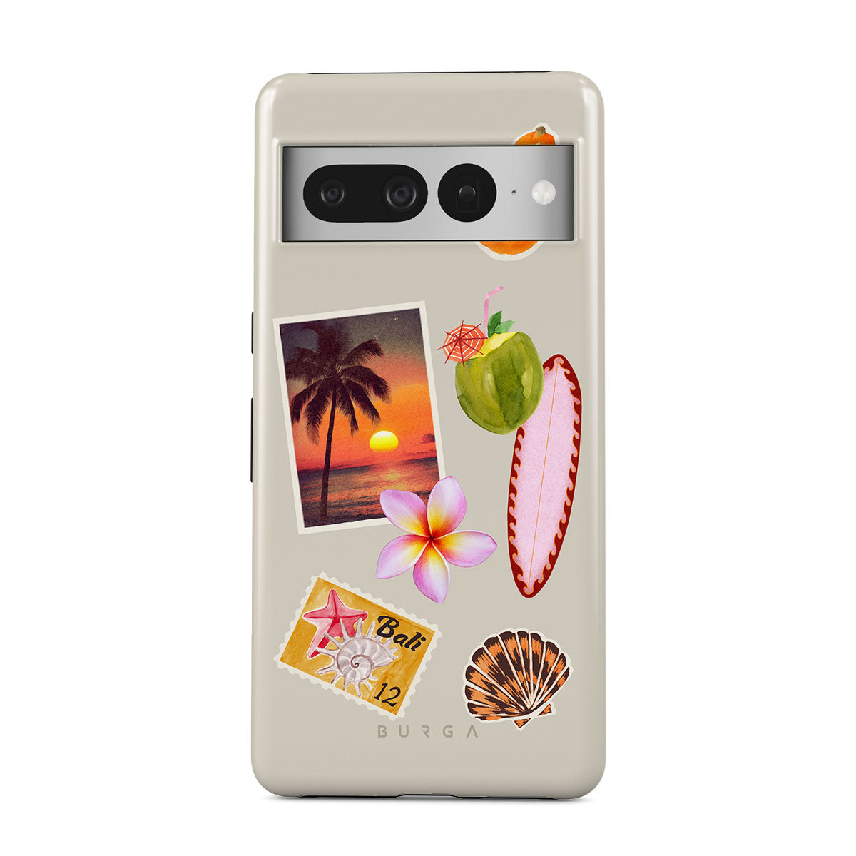 Questo design include: foto di tramonto tropicale, papaya, noce di cocco verde, tavola da surf rosa, fiore di plumeria rosa, conchiglia arancione, cartolina di Bali.
