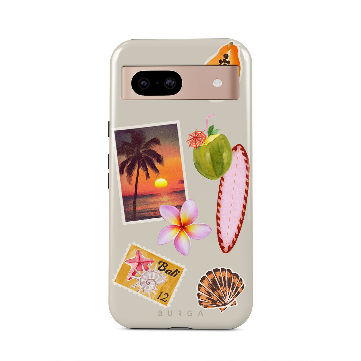 Questo design include: foto di tramonto tropicale, papaya, noce di cocco verde, tavola da surf rosa, fiore di plumeria rosa, conchiglia arancione, cartolina di Bali.