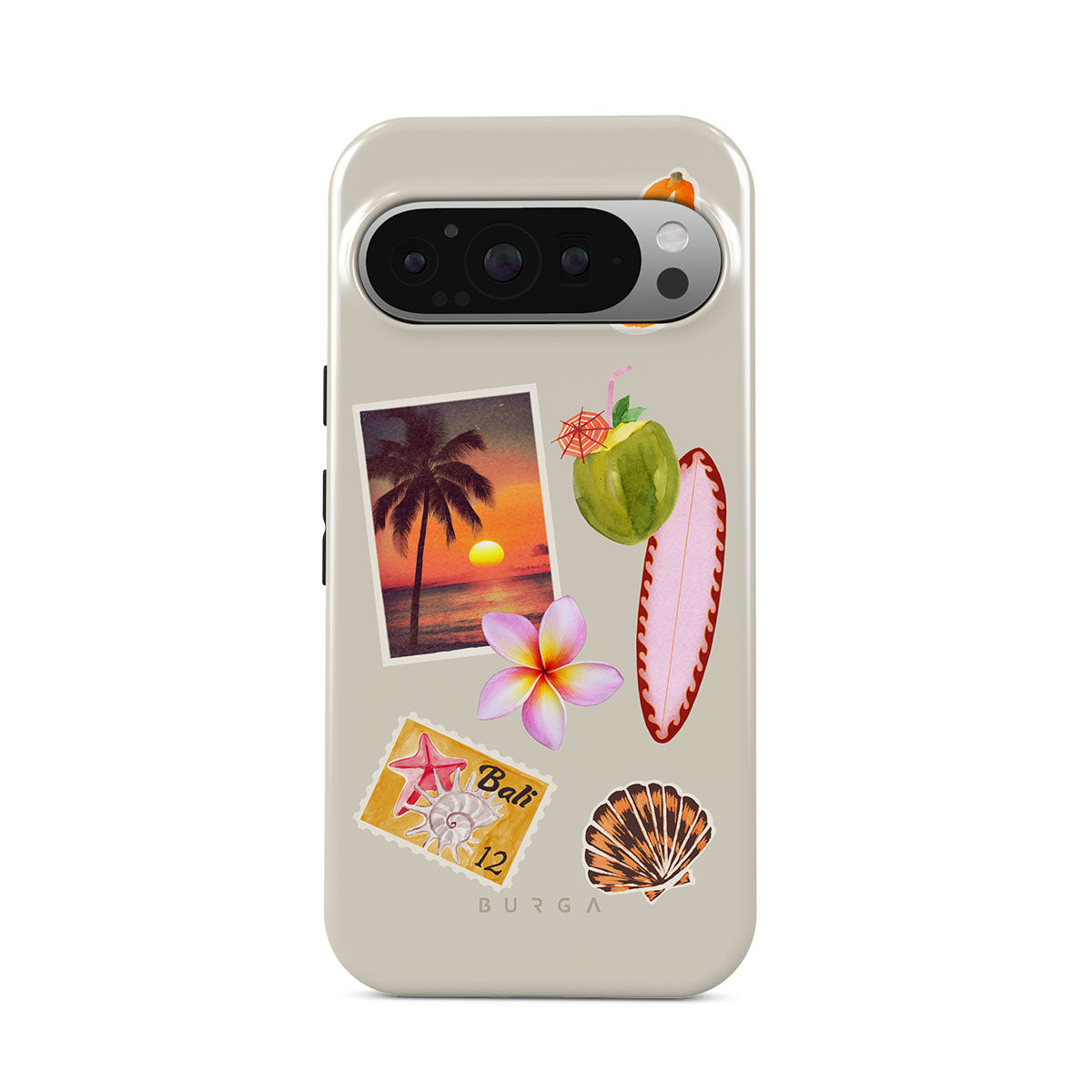 Questo design include: foto di tramonto tropicale, papaya, noce di cocco verde, tavola da surf rosa, fiore di plumeria rosa, conchiglia arancione, cartolina di Bali.