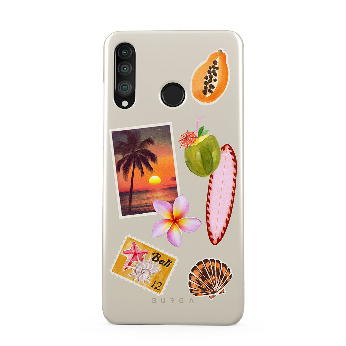 Questo design include: foto di tramonto tropicale, papaya, noce di cocco verde, tavola da surf rosa, fiore di plumeria rosa, conchiglia arancione, cartolina di Bali.