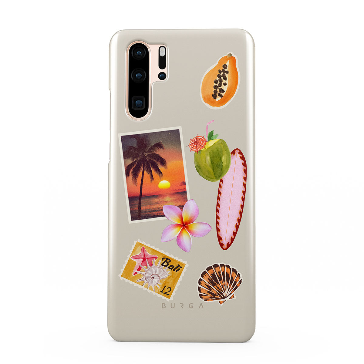 Questo design include: foto di tramonto tropicale, papaya, noce di cocco verde, tavola da surf rosa, fiore di plumeria rosa, conchiglia arancione, cartolina di Bali.