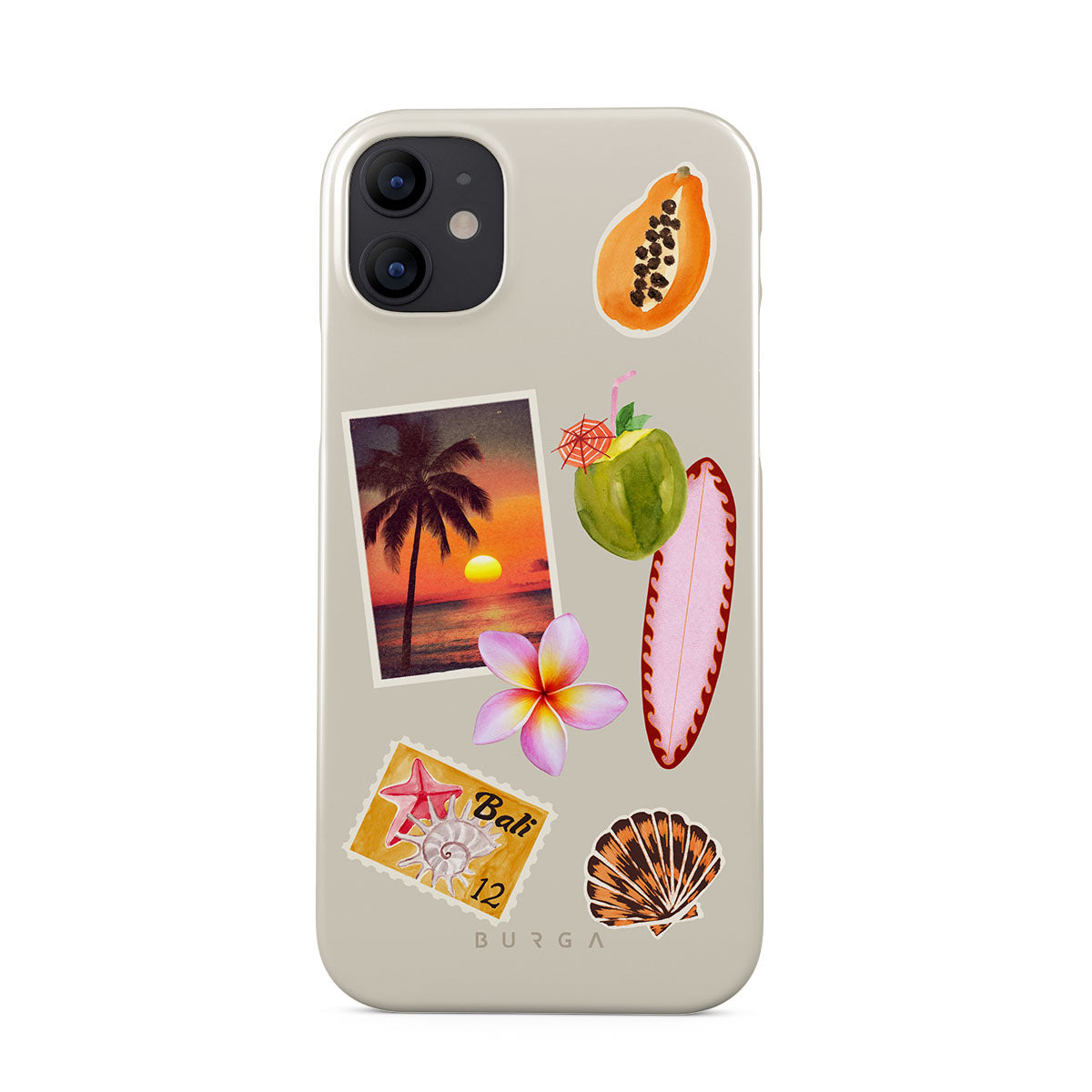Questo design include: foto di tramonto tropicale, papaya, noce di cocco verde, tavola da surf rosa, fiore di plumeria rosa, conchiglia arancione, cartolina di Bali.