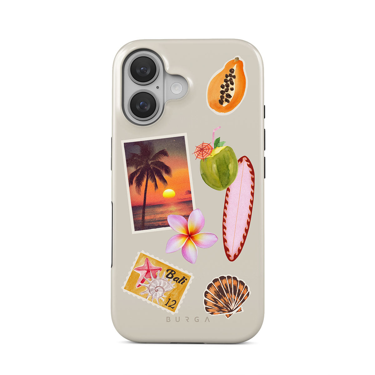 Questo design include: foto di tramonto tropicale, papaya, noce di cocco verde, tavola da surf rosa, fiore di plumeria rosa, conchiglia arancione, cartolina di Bali.