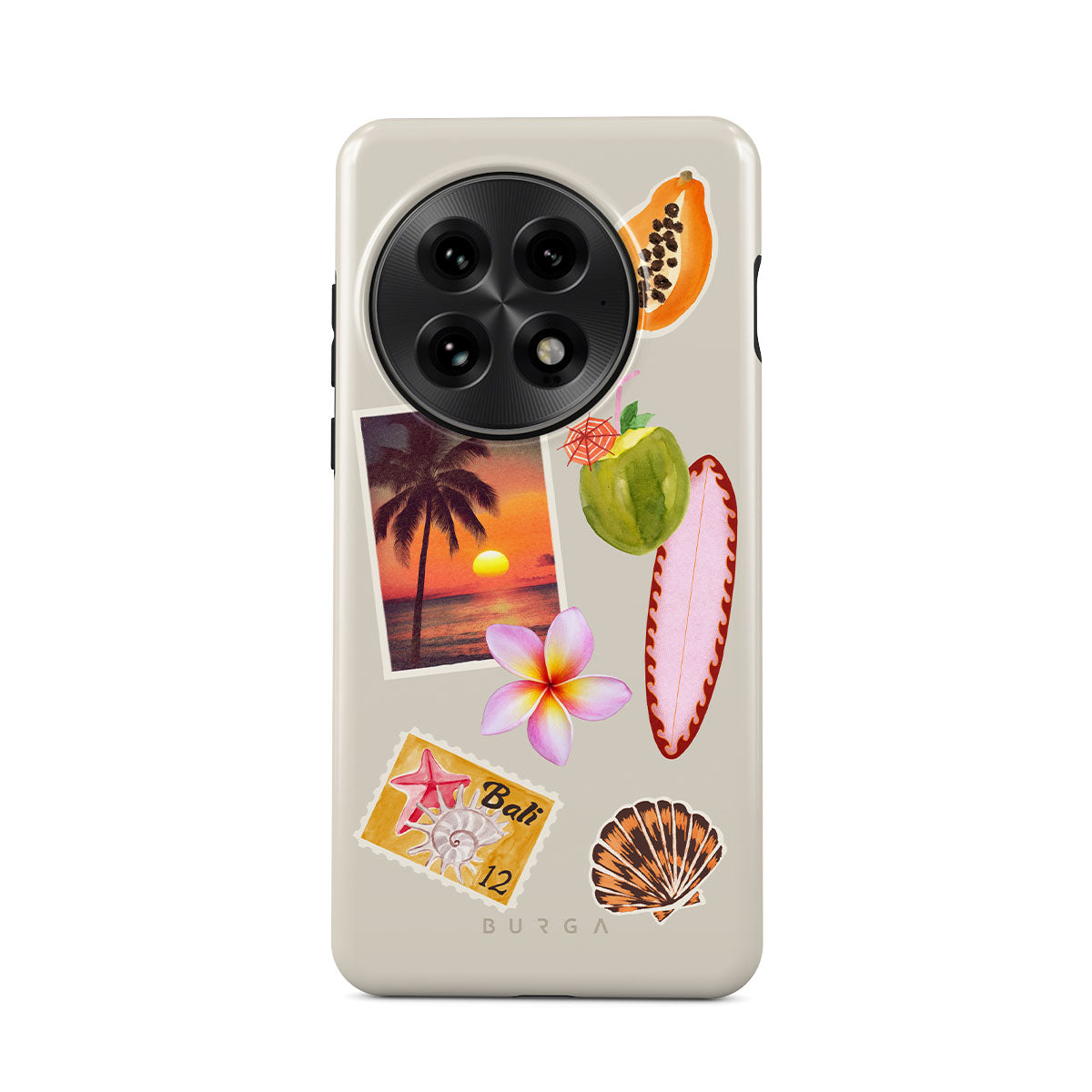 Questo design include: foto di tramonto tropicale, papaya, noce di cocco verde, tavola da surf rosa, fiore di plumeria rosa, conchiglia arancione, cartolina di Bali.