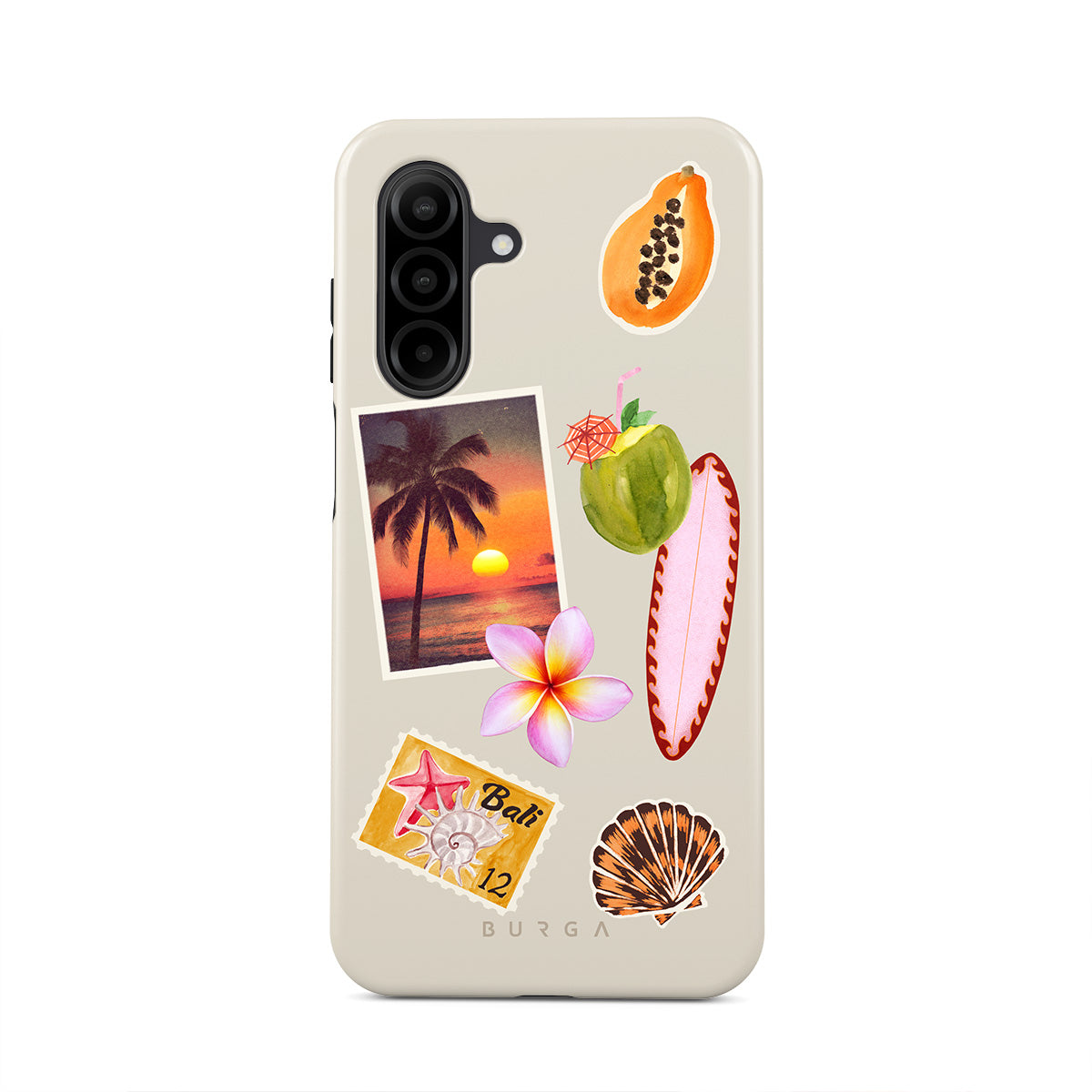 Questo design include: foto di tramonto tropicale, papaya, noce di cocco verde, tavola da surf rosa, fiore di plumeria rosa, conchiglia arancione, cartolina di Bali.