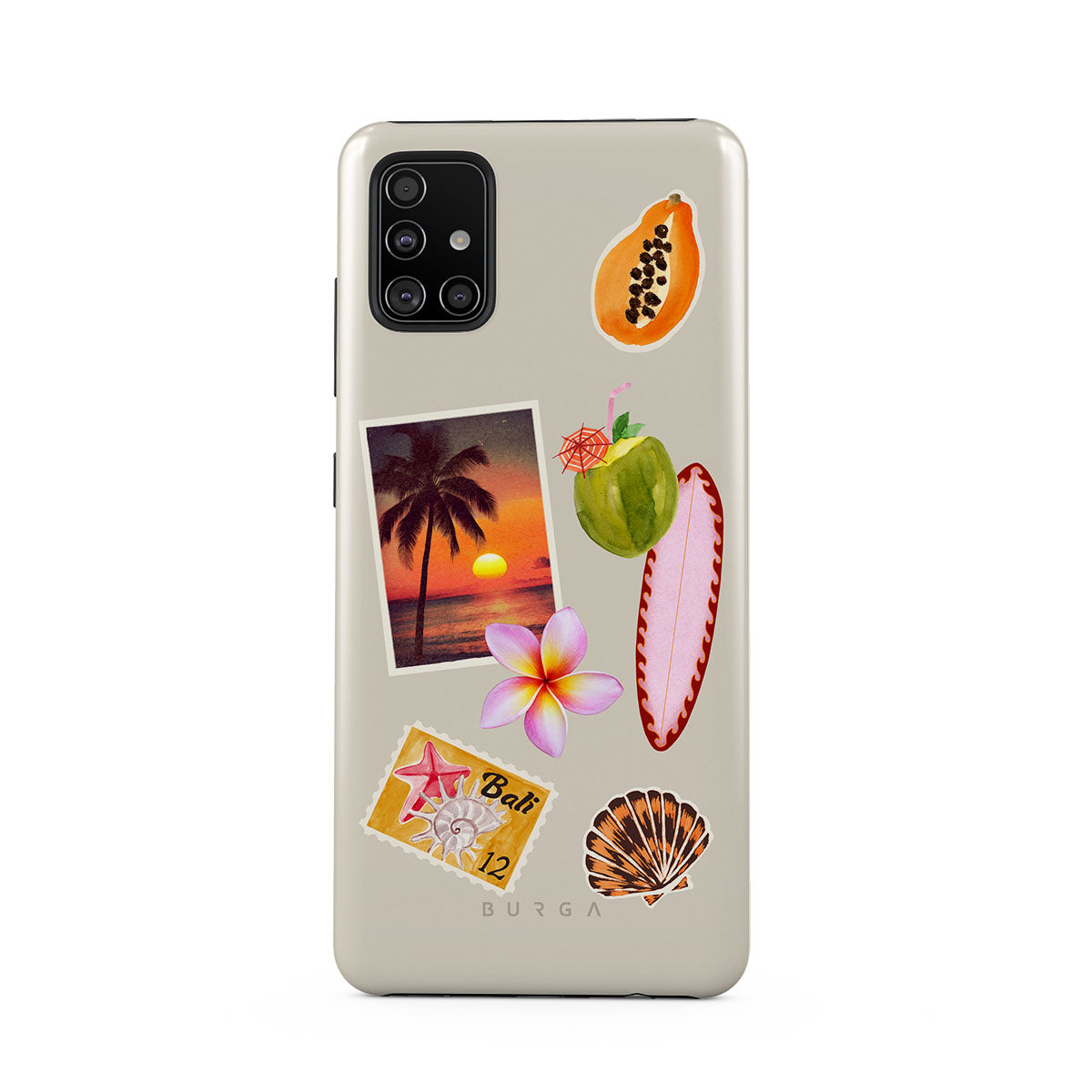 Questo design include: foto di tramonto tropicale, papaya, noce di cocco verde, tavola da surf rosa, fiore di plumeria rosa, conchiglia arancione, cartolina di Bali.