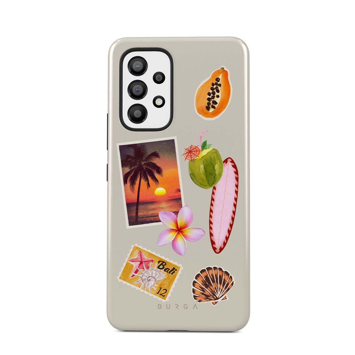 Questo design include: foto di tramonto tropicale, papaya, noce di cocco verde, tavola da surf rosa, fiore di plumeria rosa, conchiglia arancione, cartolina di Bali.