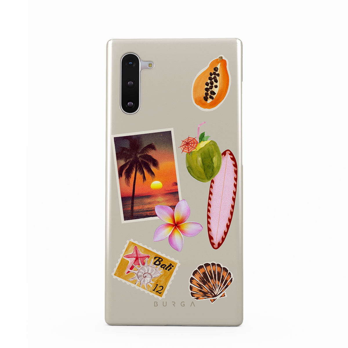 Questo design include: foto di tramonto tropicale, papaya, noce di cocco verde, tavola da surf rosa, fiore di plumeria rosa, conchiglia arancione, cartolina di Bali.