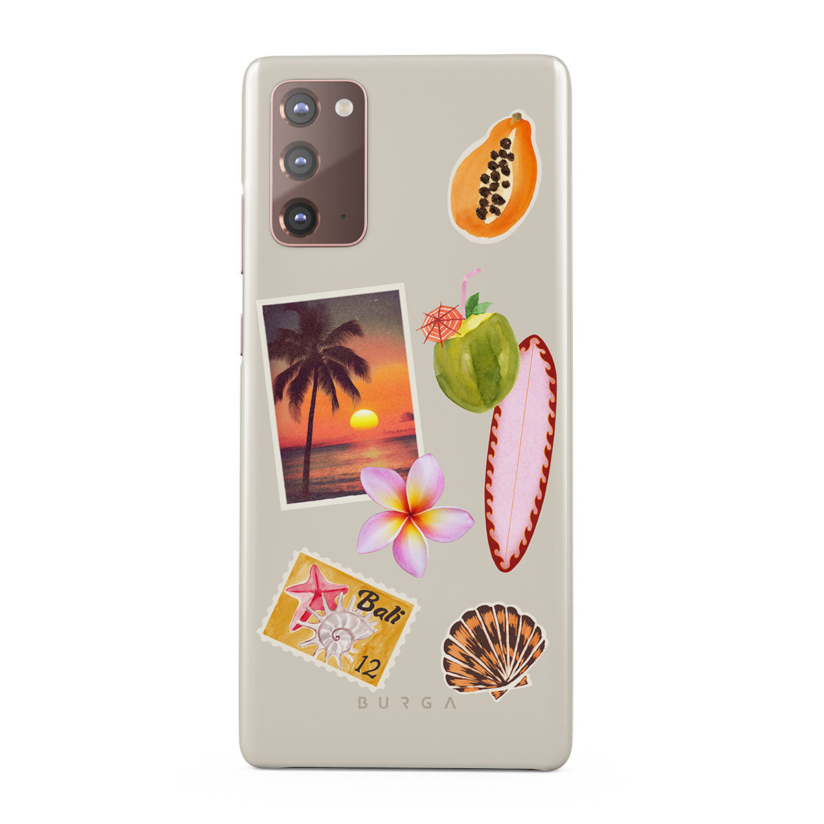Questo design include: foto di tramonto tropicale, papaya, noce di cocco verde, tavola da surf rosa, fiore di plumeria rosa, conchiglia arancione, cartolina di Bali.
