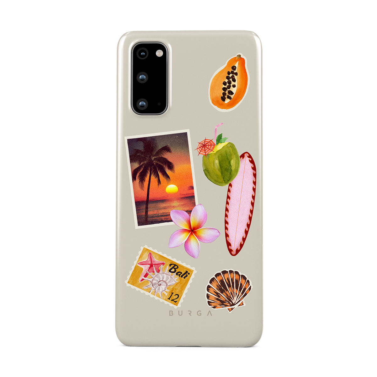 Questo design include: foto di tramonto tropicale, papaya, noce di cocco verde, tavola da surf rosa, fiore di plumeria rosa, conchiglia arancione, cartolina di Bali.