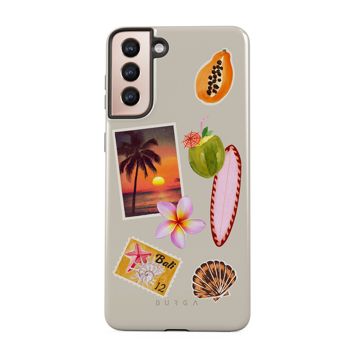 Questo design include: foto di tramonto tropicale, papaya, noce di cocco verde, tavola da surf rosa, fiore di plumeria rosa, conchiglia arancione, cartolina di Bali.