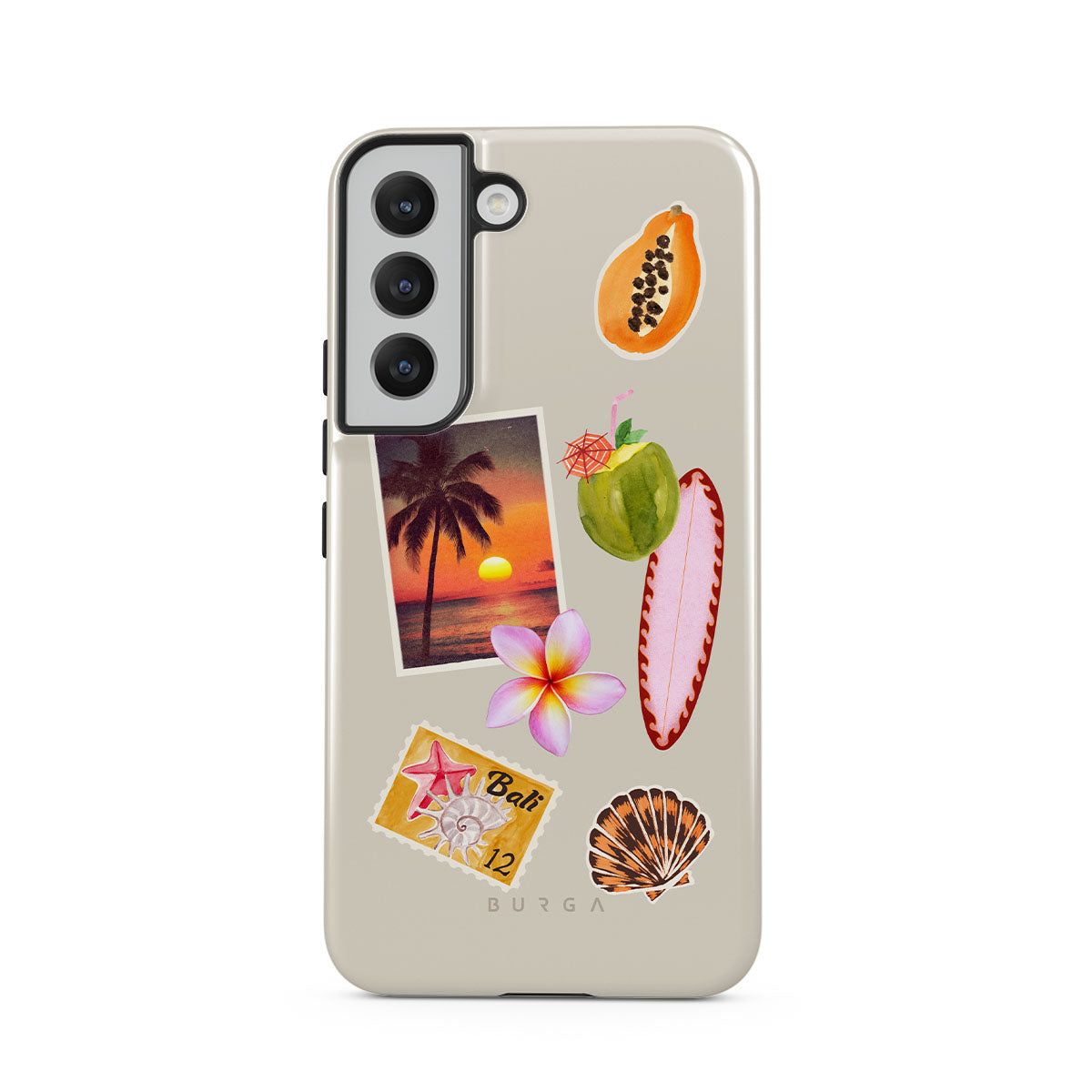 Questo design include: foto di tramonto tropicale, papaya, noce di cocco verde, tavola da surf rosa, fiore di plumeria rosa, conchiglia arancione, cartolina di Bali.