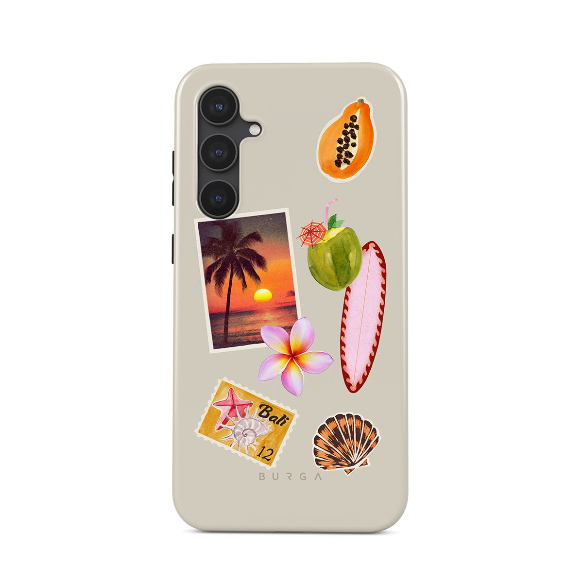 Questo design include: foto di tramonto tropicale, papaya, noce di cocco verde, tavola da surf rosa, fiore di plumeria rosa, conchiglia arancione, cartolina di Bali.