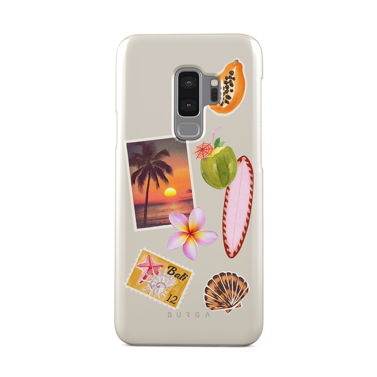 Questo design include: foto di tramonto tropicale, papaya, noce di cocco verde, tavola da surf rosa, fiore di plumeria rosa, conchiglia arancione, cartolina di Bali.