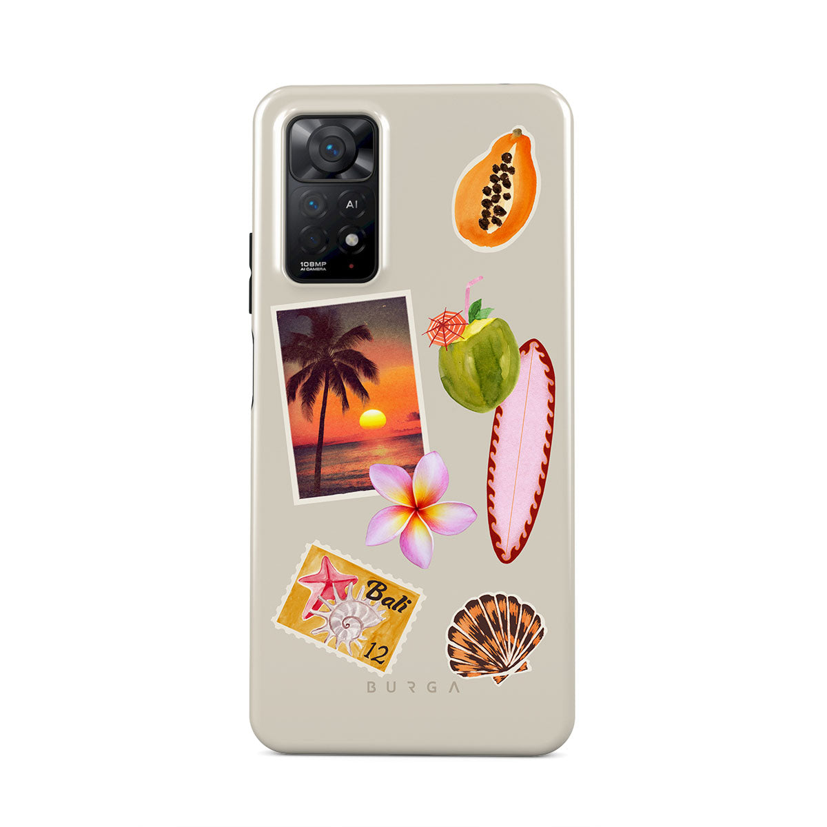 Questo design include: foto di tramonto tropicale, papaya, noce di cocco verde, tavola da surf rosa, fiore di plumeria rosa, conchiglia arancione, cartolina di Bali.