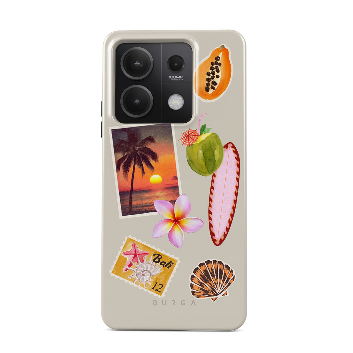 Questo design include: foto di tramonto tropicale, papaya, noce di cocco verde, tavola da surf rosa, fiore di plumeria rosa, conchiglia arancione, cartolina di Bali.
