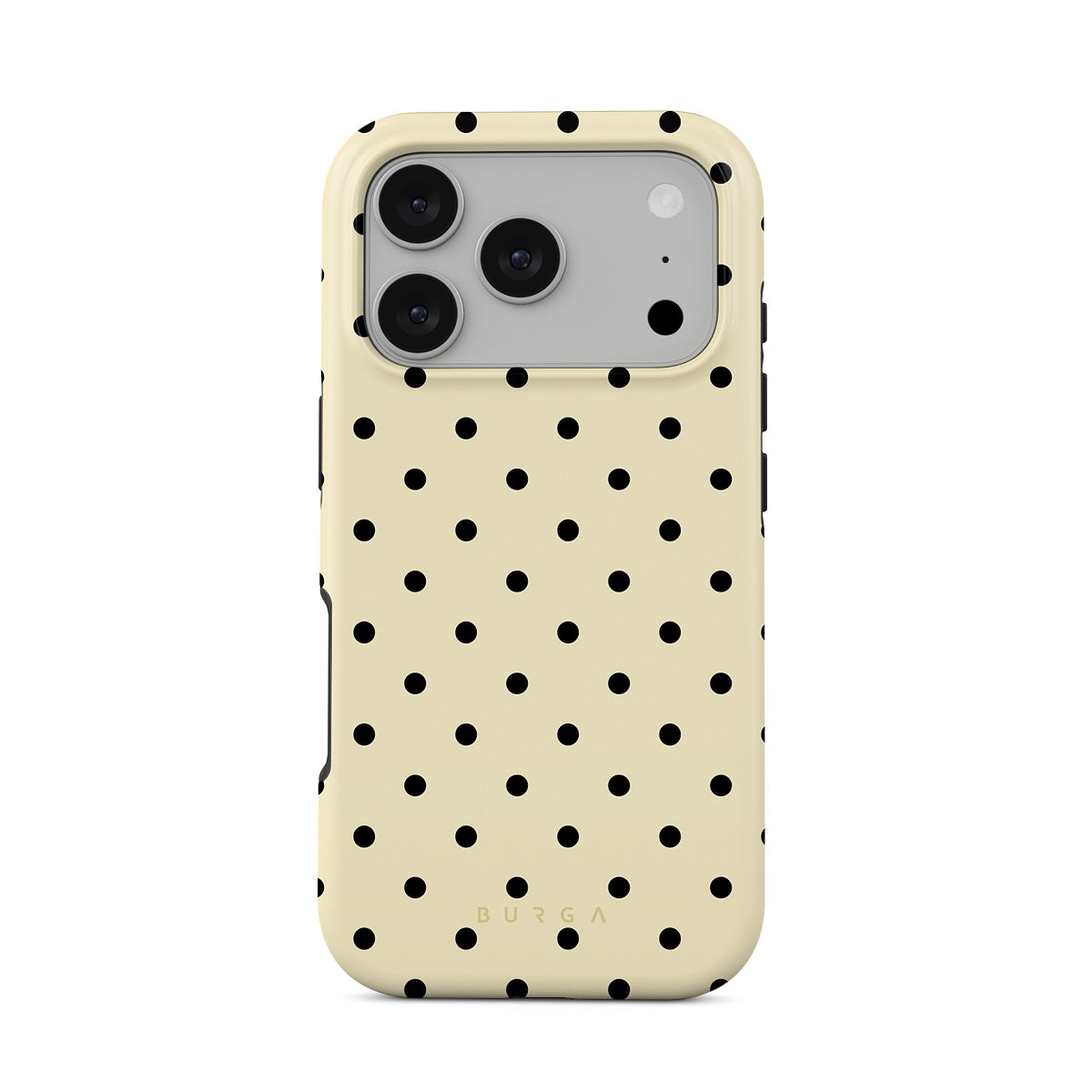 Questo design include: uno sfondo beige con piccoli pois neri.