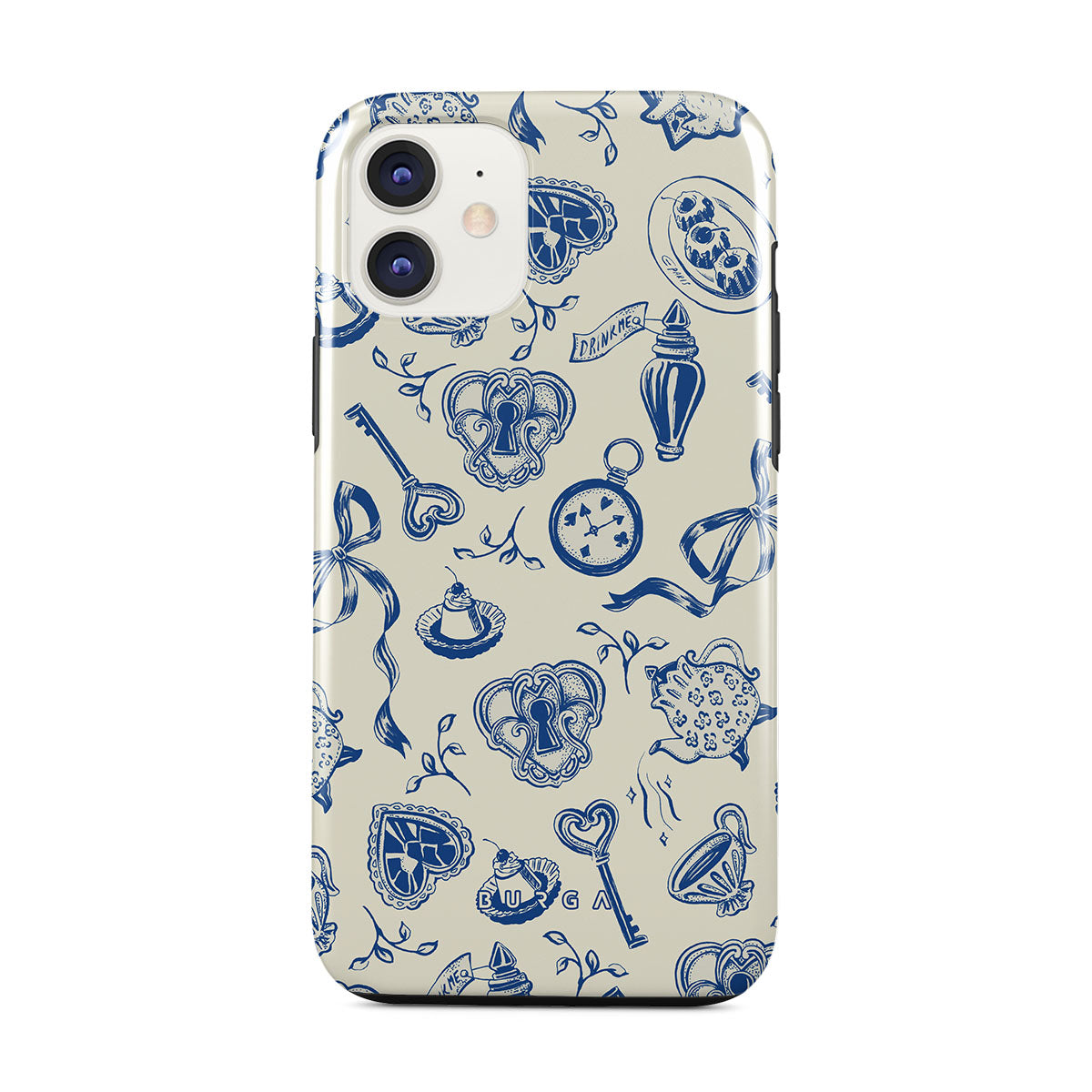 Questo design include: tazze da tè, teiere, orologi da tasca, chiave, cuori, ceramica, motivo blu e bianco