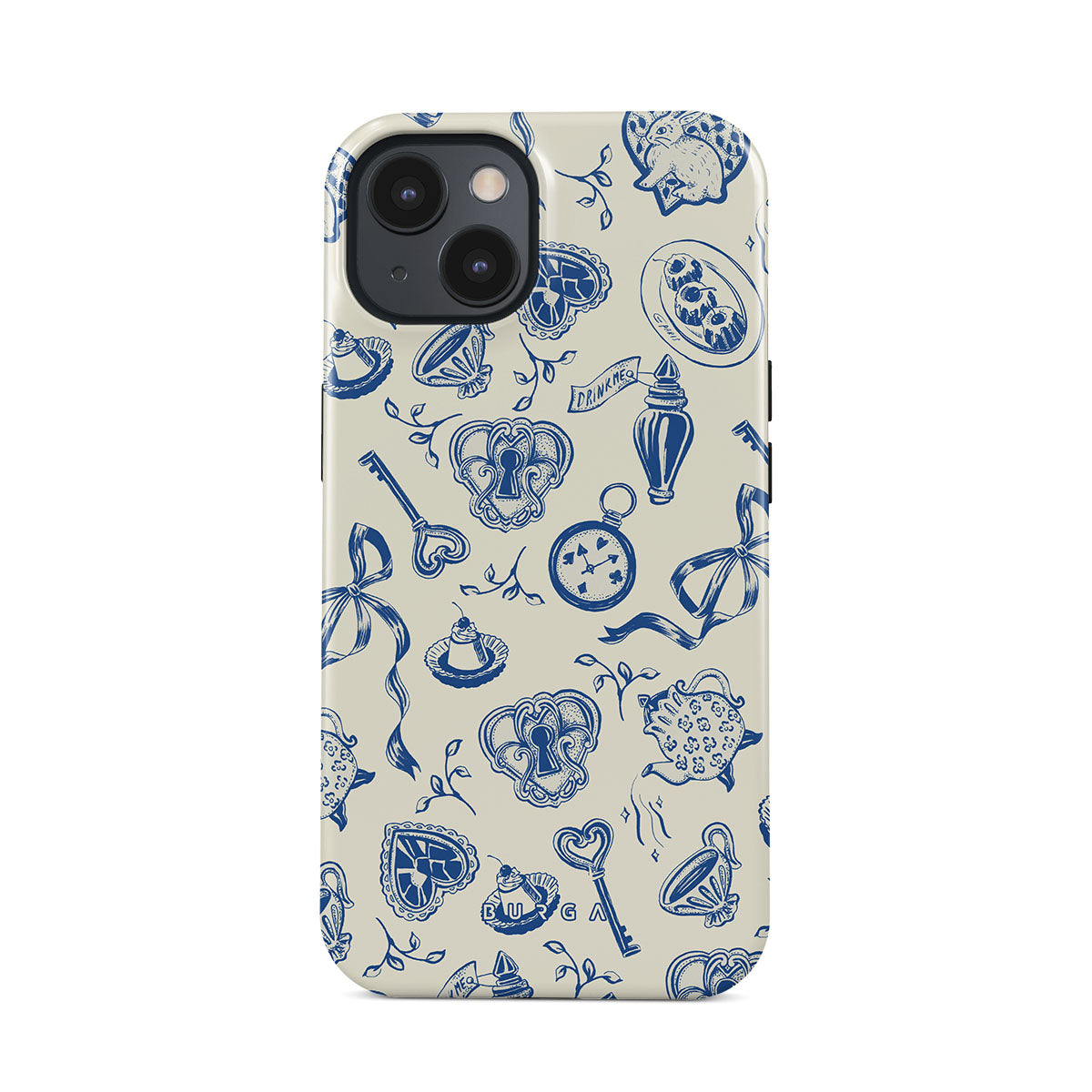 Questo design include: tazze da tè, teiere, orologi da tasca, chiave, cuori, ceramica, motivo blu e bianco