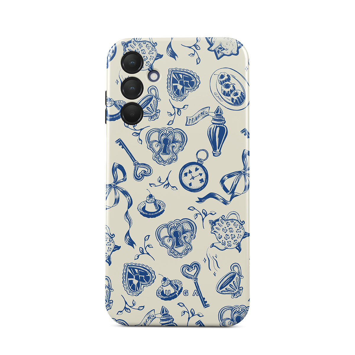 Questo design include: tazze da tè, teiere, orologi da tasca, chiave, cuori, ceramica, motivo blu e bianco