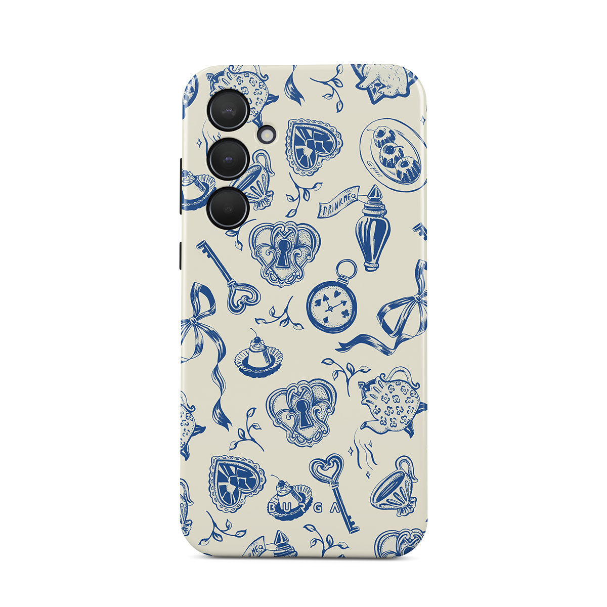 Questo design include: tazze da tè, teiere, orologi da tasca, chiave, cuori, ceramica, motivo blu e bianco