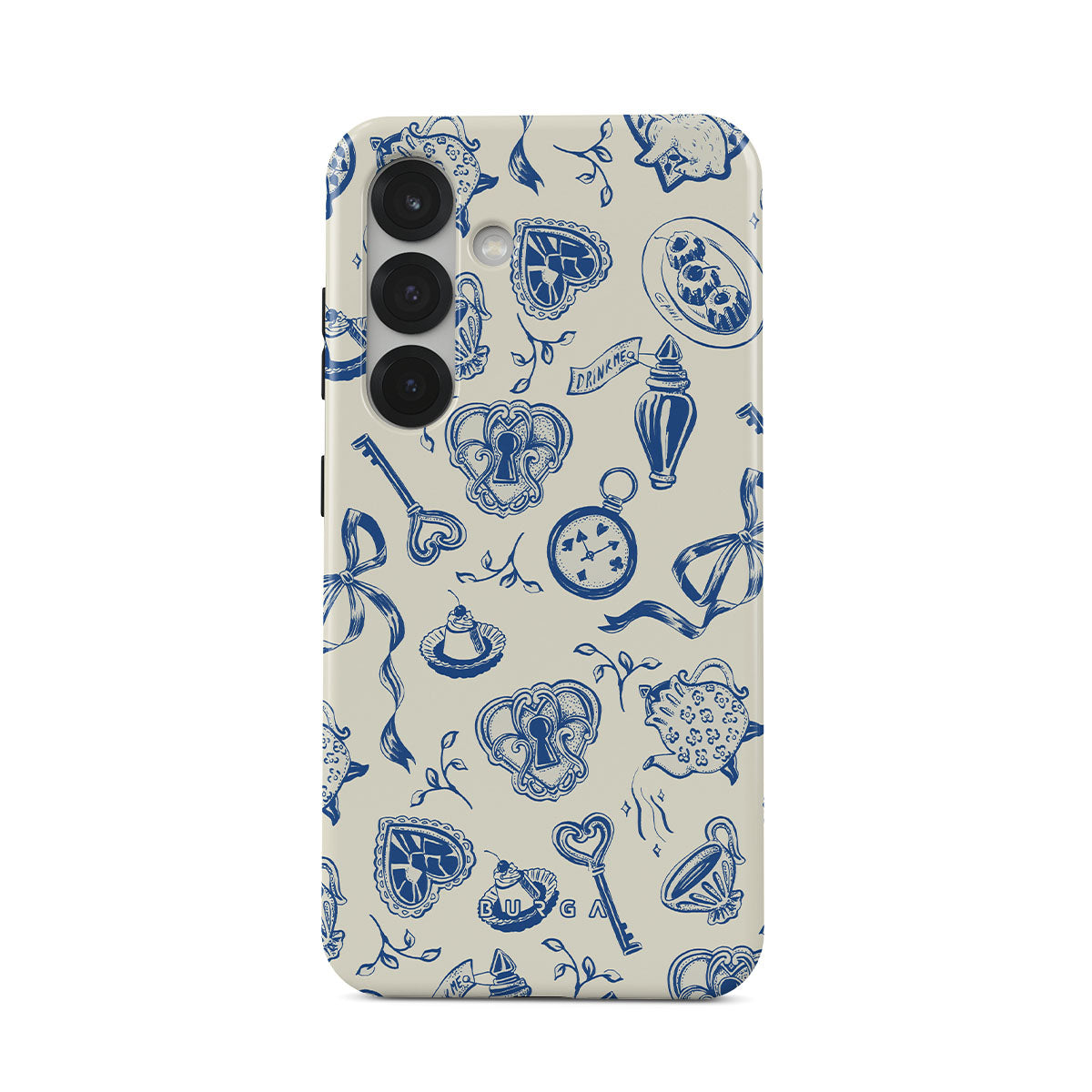 Questo design include: tazze da tè, teiere, orologi da tasca, chiave, cuori, ceramica, motivo blu e bianco