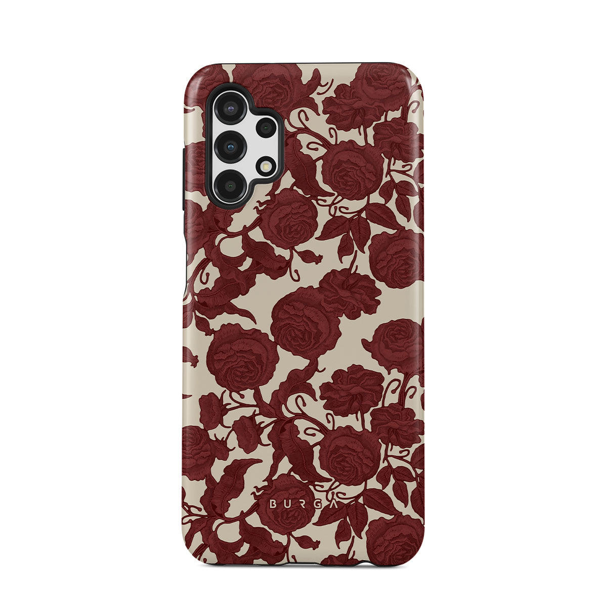 Questo design presenta: rose rosso scuro, motivo floreale intricato, motivo vintage.
