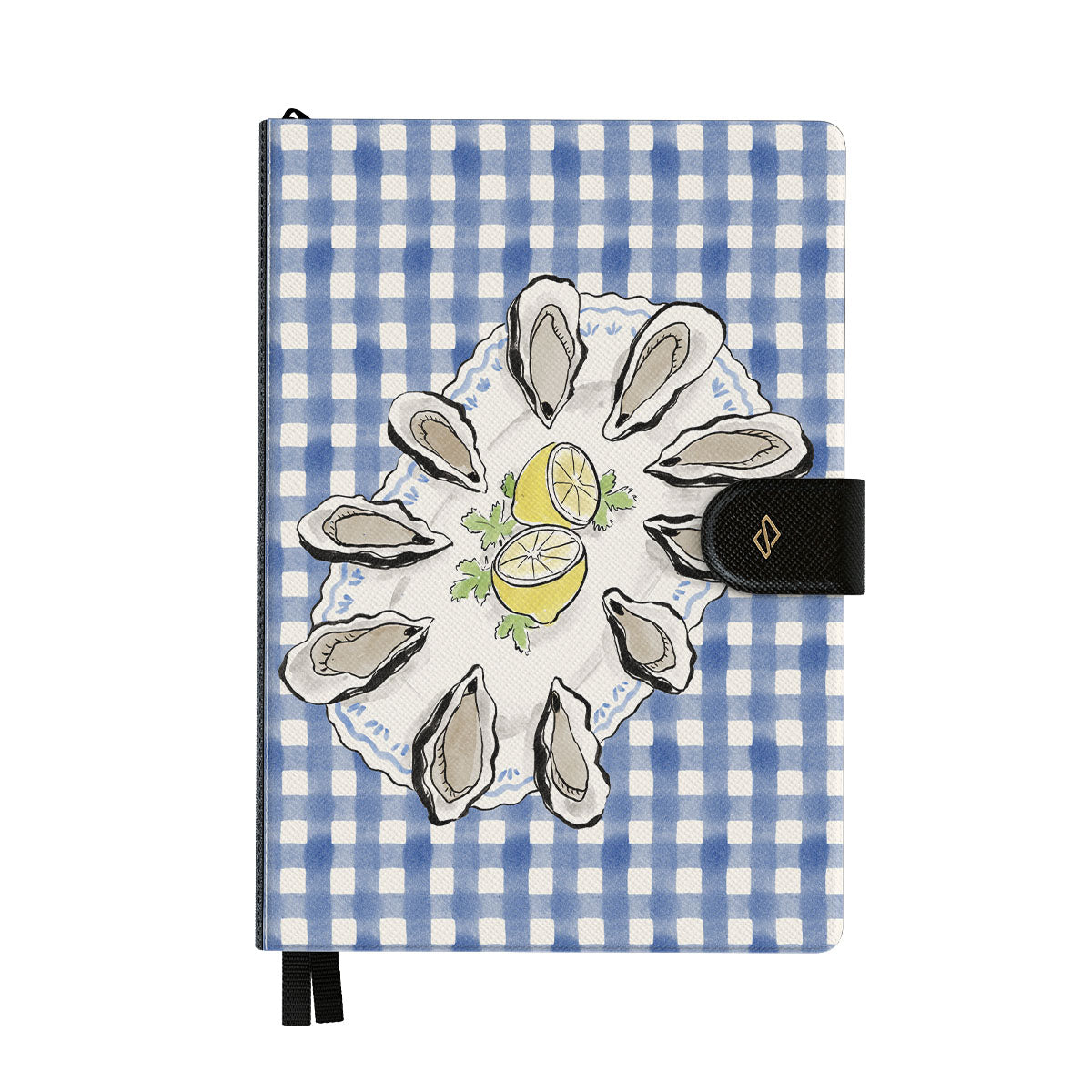 Questo design include: Ostriche, limone, gingham blu, elementi costieri freschi, toni pastello morbidi.