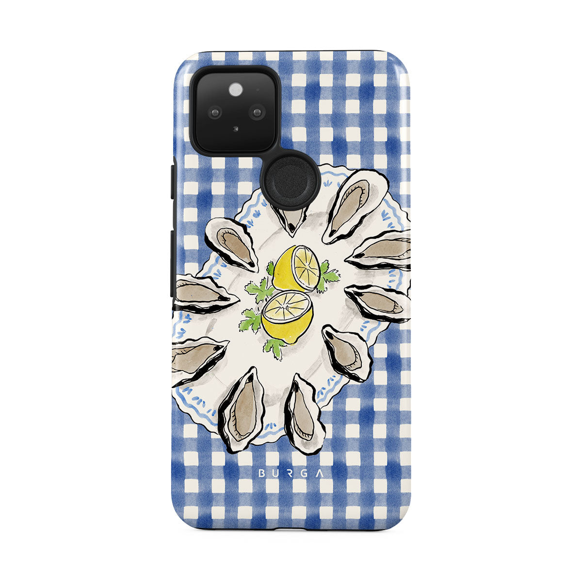 Questo design include: Ostriche, limone, gingham blu, elementi costieri freschi, toni pastello morbidi.