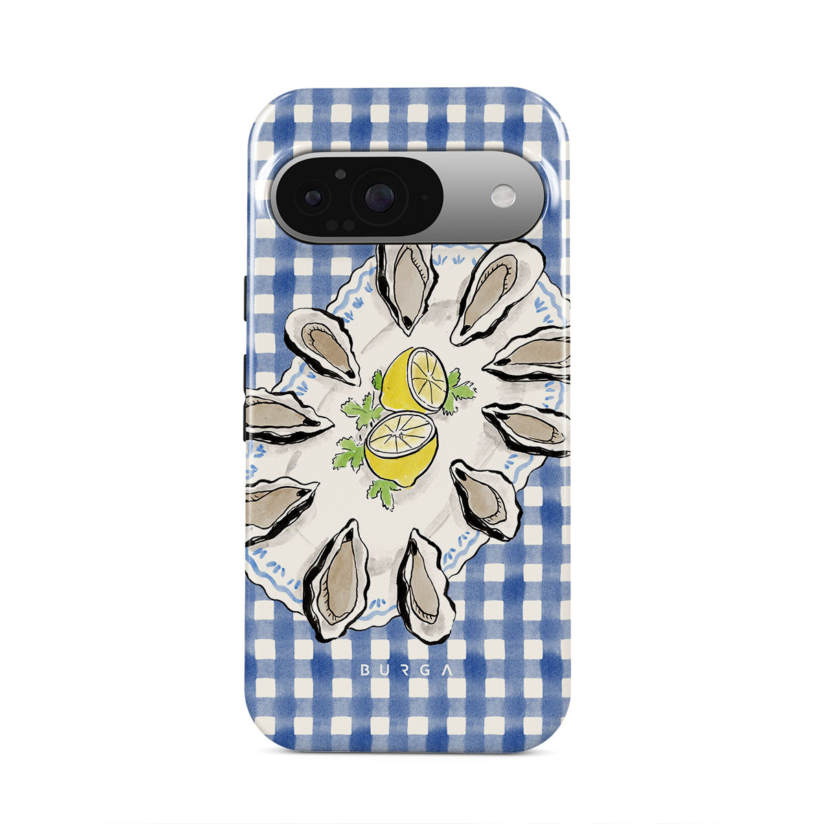 Questo design include: Ostriche, limone, gingham blu, elementi costieri freschi, toni pastello morbidi.