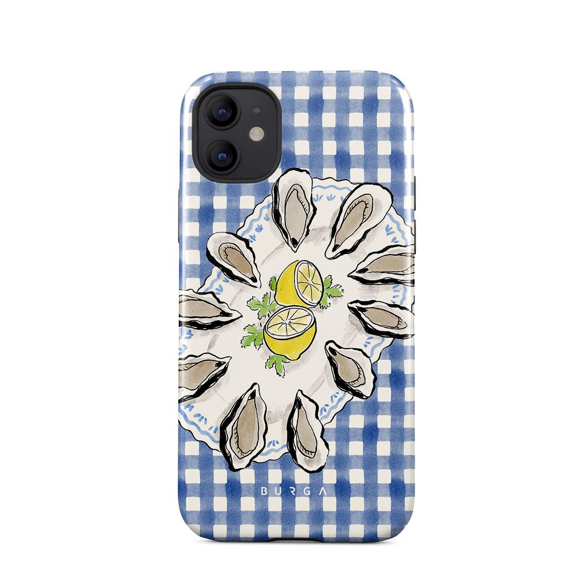 Questo design include: Ostriche, limone, gingham blu, elementi costieri freschi, toni pastello morbidi.