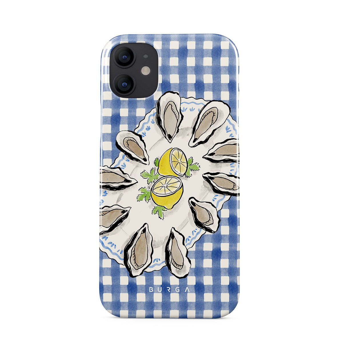 Questo design include: Ostriche, limone, gingham blu, elementi costieri freschi, toni pastello morbidi.