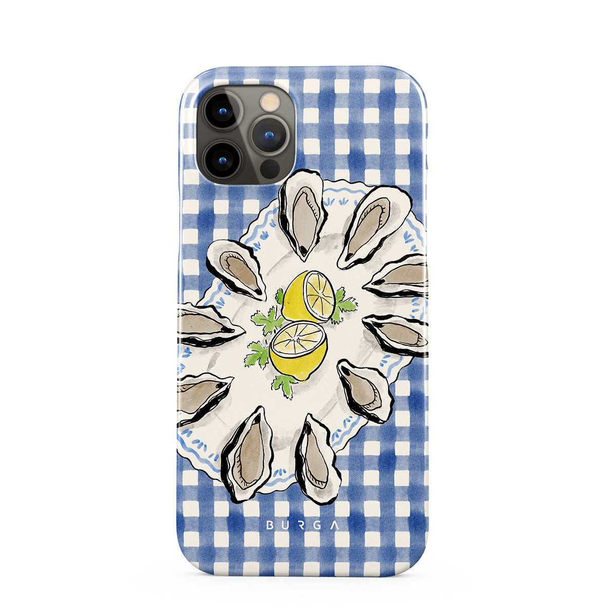 Questo design include: Ostriche, limone, gingham blu, elementi costieri freschi, toni pastello morbidi.
