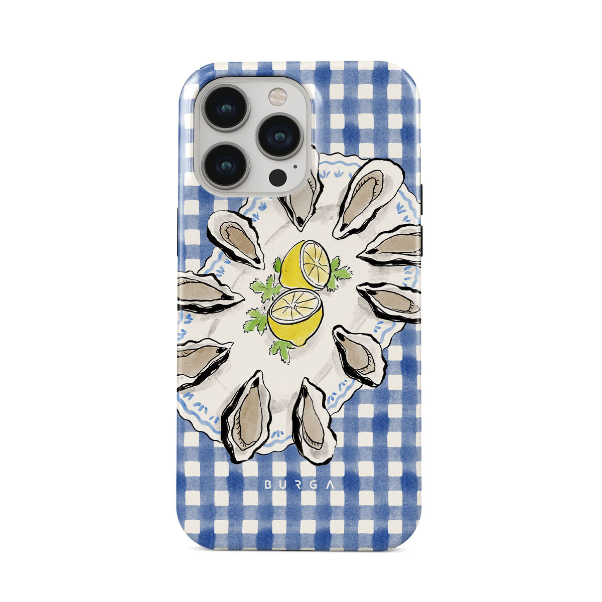 Questo design include: Ostriche, limone, gingham blu, elementi costieri freschi, toni pastello morbidi.