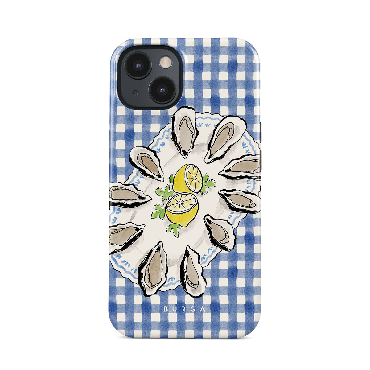 Questo design include: Ostriche, limone, gingham blu, elementi costieri freschi, toni pastello morbidi.