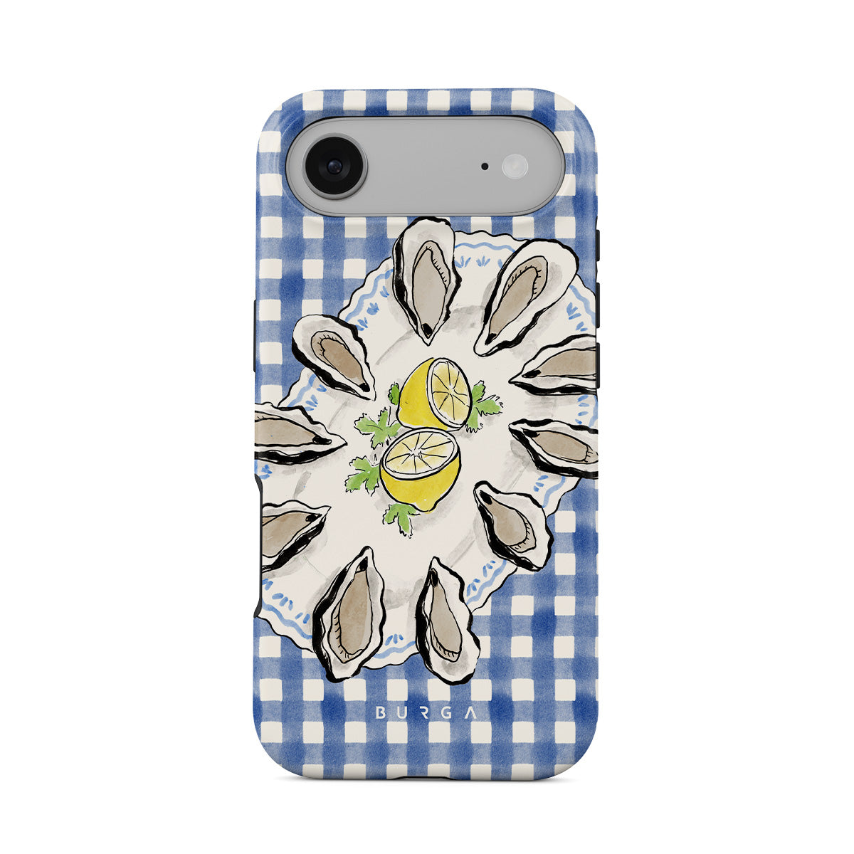 Questo design include: Ostriche, limone, gingham blu, elementi costieri freschi, toni pastello morbidi.