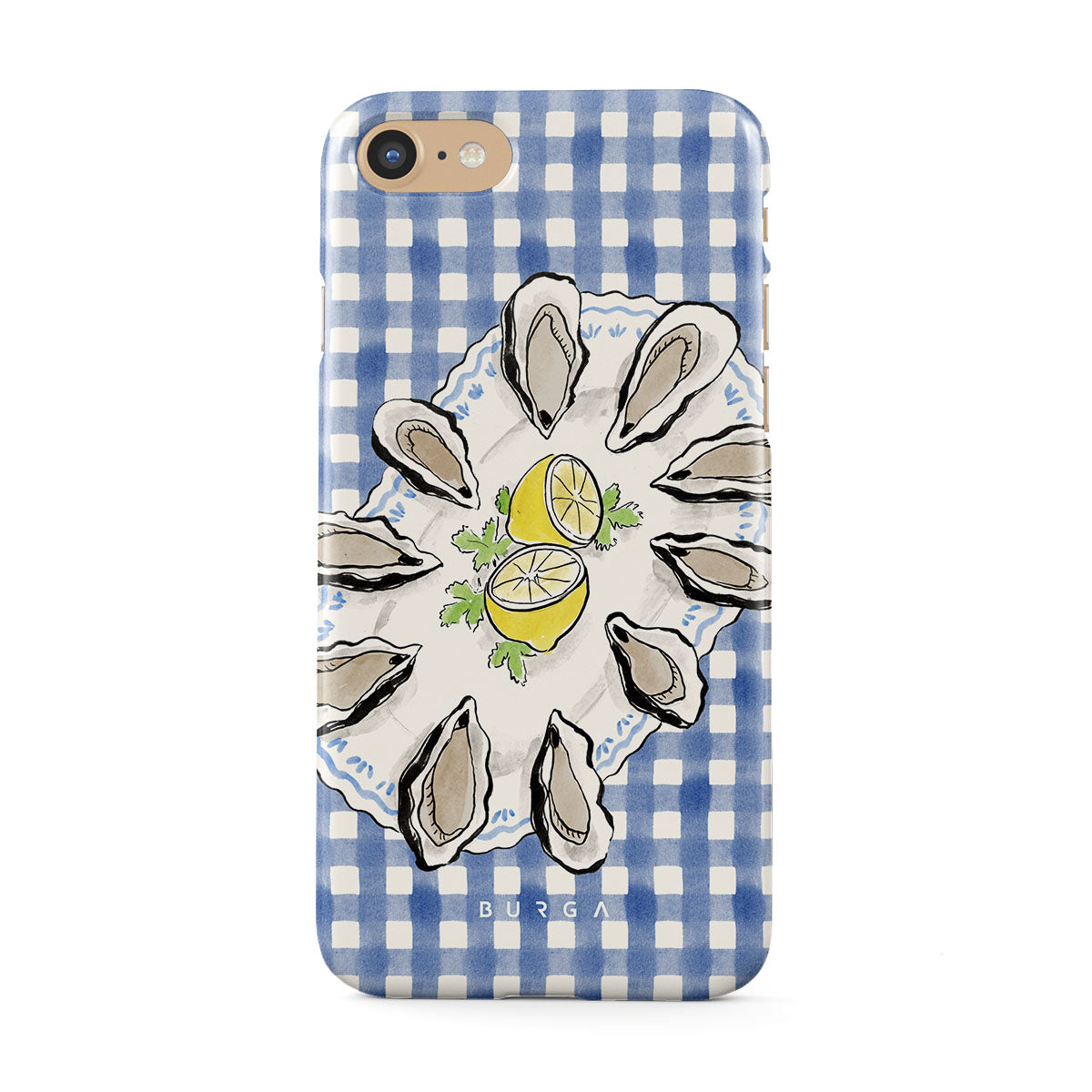 Questo design include: Ostriche, limone, gingham blu, elementi costieri freschi, toni pastello morbidi.