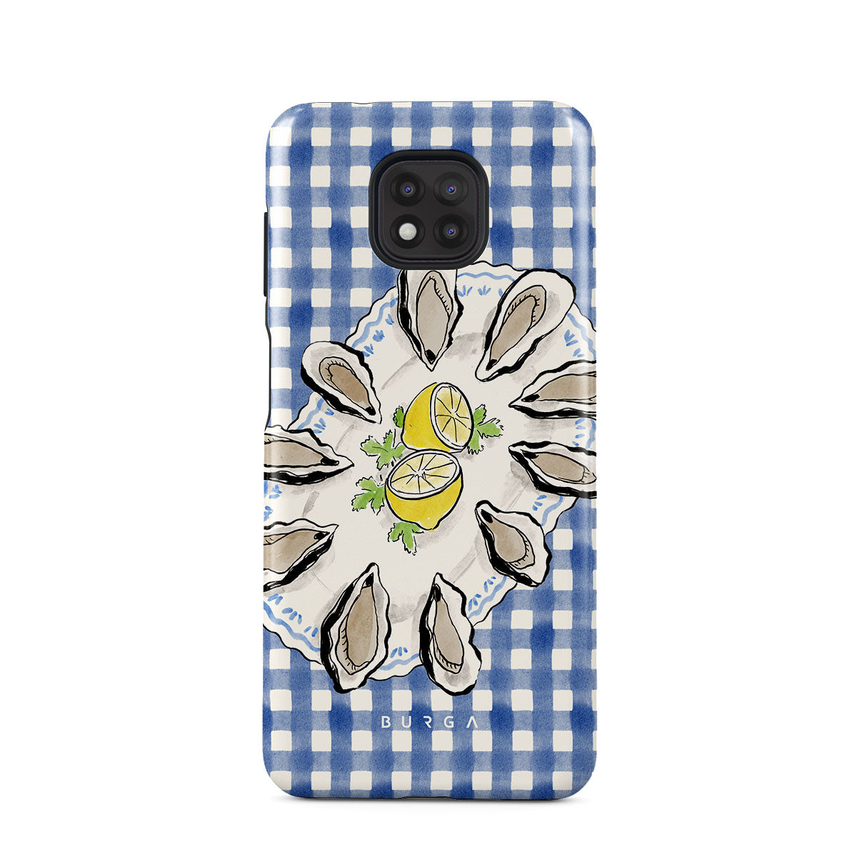 Questo design include: Ostriche, limone, gingham blu, elementi costieri freschi, toni pastello morbidi.