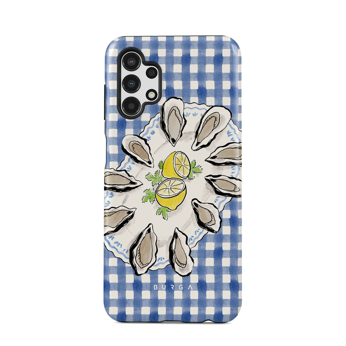 Questo design include: Ostriche, limone, gingham blu, elementi costieri freschi, toni pastello morbidi.