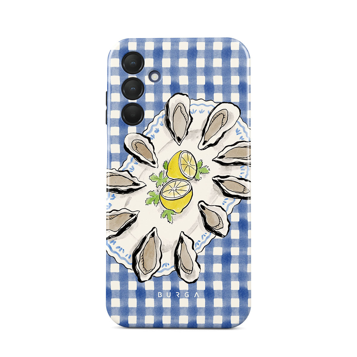 Questo design include: Ostriche, limone, gingham blu, elementi costieri freschi, toni pastello morbidi.