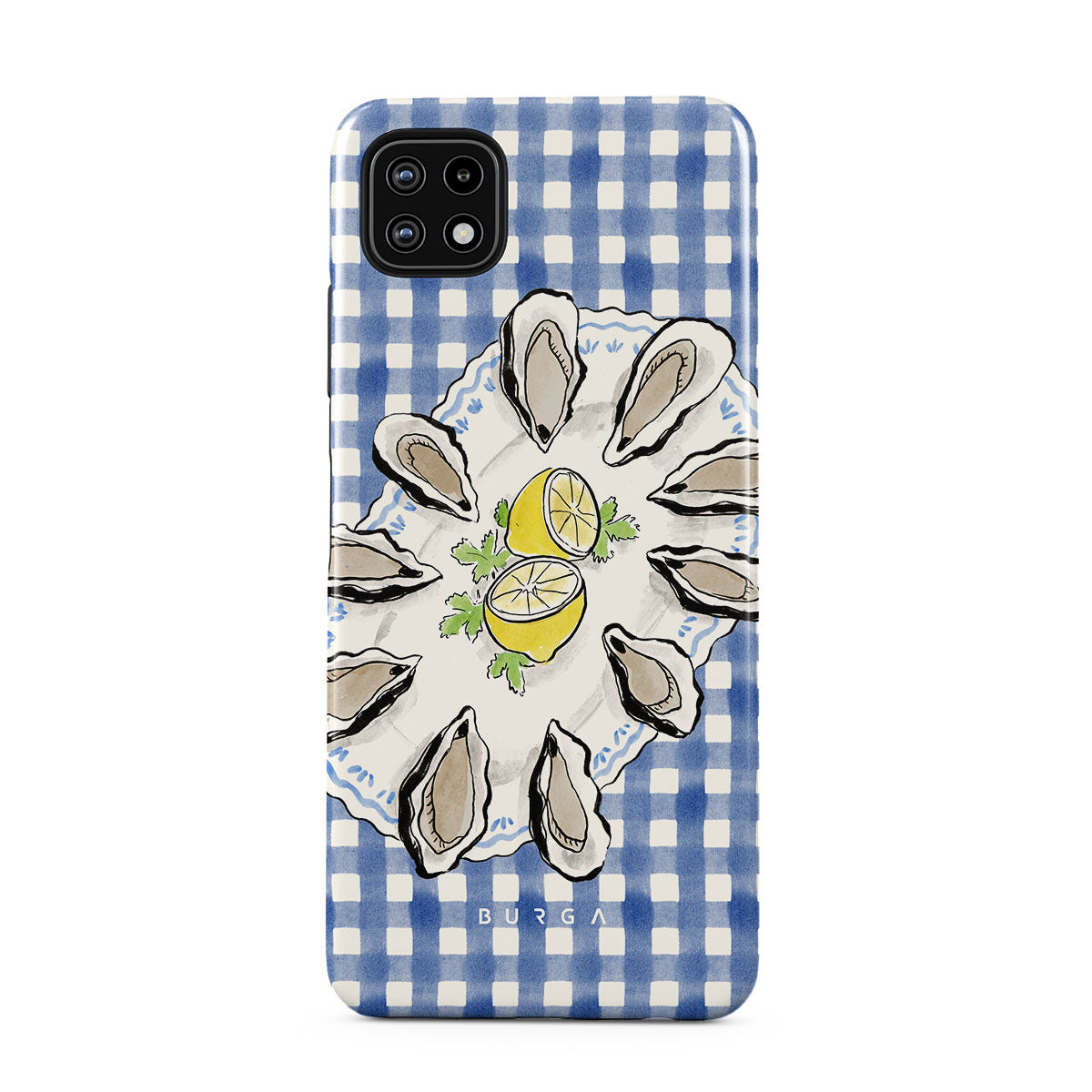 Questo design include: Ostriche, limone, gingham blu, elementi costieri freschi, toni pastello morbidi.