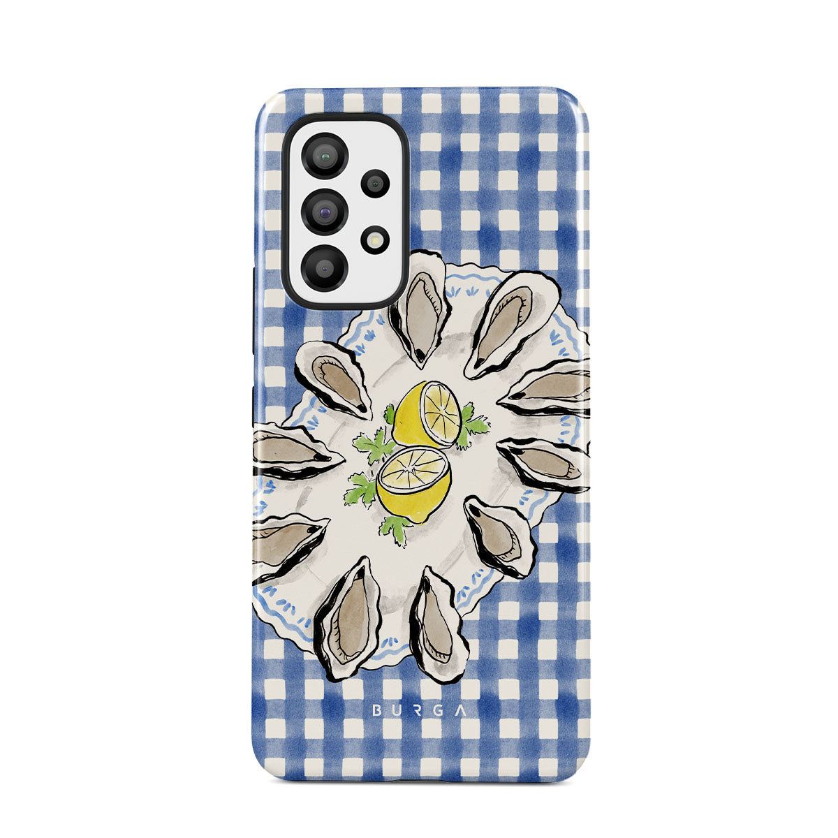 Questo design include: Ostriche, limone, gingham blu, elementi costieri freschi, toni pastello morbidi.