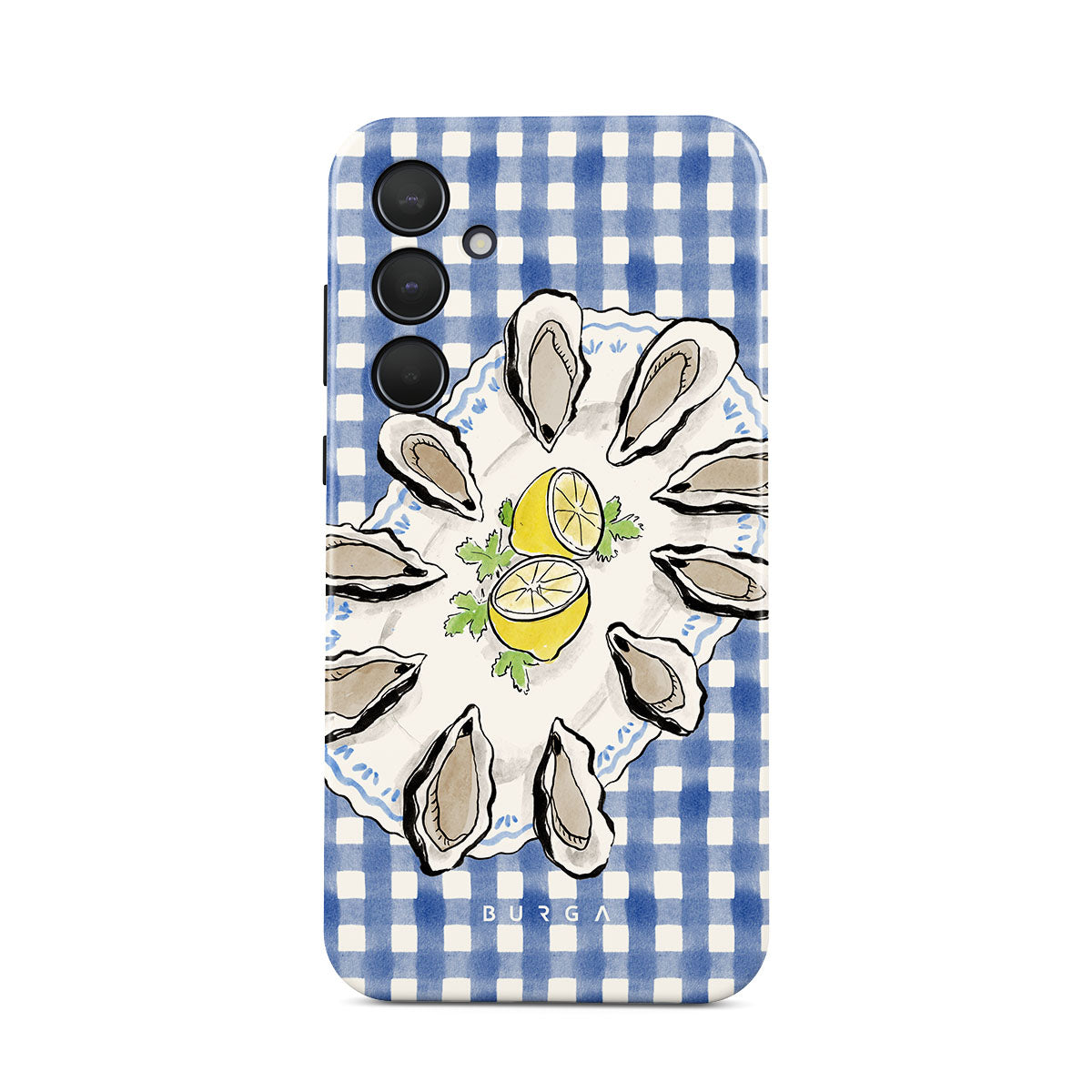 Questo design include: Ostriche, limone, gingham blu, elementi costieri freschi, toni pastello morbidi.